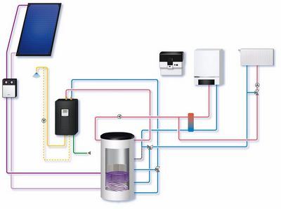 Solarthermie-Anlagen bestehen aus Kollektor, einem Pufferspeicher (am besten gemeinsam mit der Heizungsanlage), einer Pumpengruppe, einem geschlossenem Rohrkreis und einer Regelung. Erhältlich sind sowohl Anlagen für die reine Trinkwassererwärmung als auch solche für die Heizungsunterstützung. Wichtig für die Effizienz der Anlage ist eine möglichst kurze Verrohrung. Der Durchmesser der Rohrleitungen sollte sich nach der Kollektorfläche richten und möglichst klein sein.